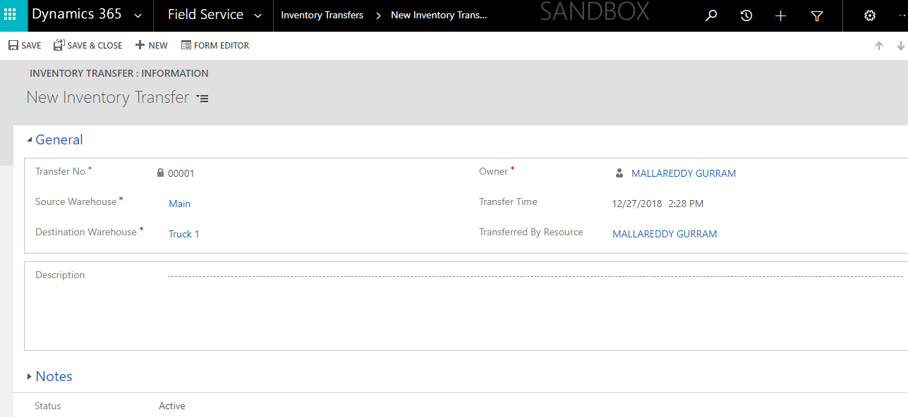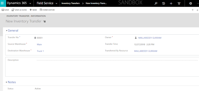 Go to > Dynamics 365 > Field Service > Inventory Transfer >