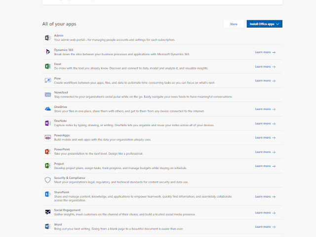 OneDrive, Word, Excel, PowerPoint, OneNote, SharePoint, Dynamics 365, Flow, Admin, Security & Compliance, Newsfeed, PowerApps,PowerPoint, Project, Social Engagement, Word