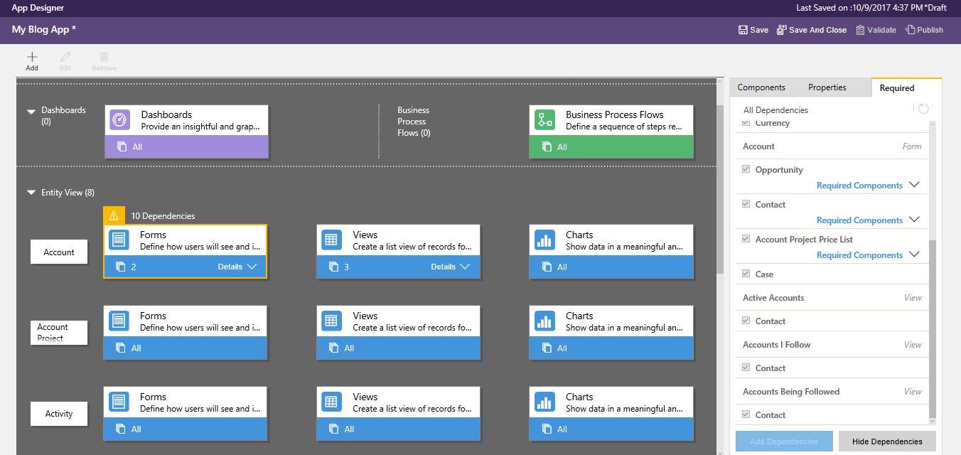 On the Screen click on the Account form then on the left hand side Required fields will appear and for the time being I have selected all the dependencies and click on the Add Dependencies button bottom of the screen.