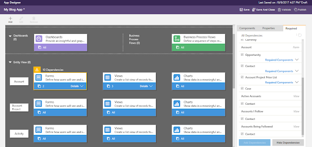 On the Screen click on the Account form then on the left hand side Required fields will appear and for the time being I have selected all the dependencies and click on the Add Dependencies button bottom of the screen.