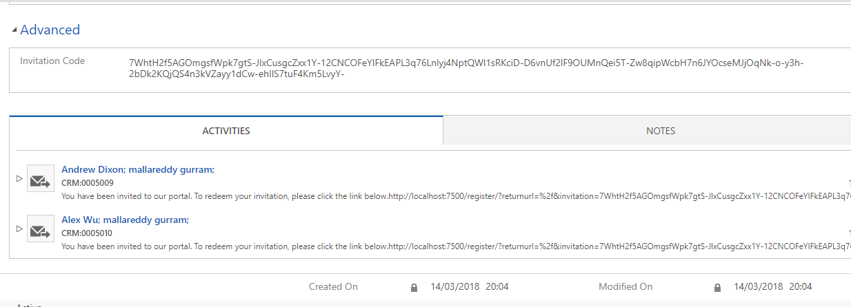 Then scroll the page and you can see in the “Activities” area click on the activities tab and you can see two emails with the invitation code inside, these email can be manually or automatically sent to the contacts.