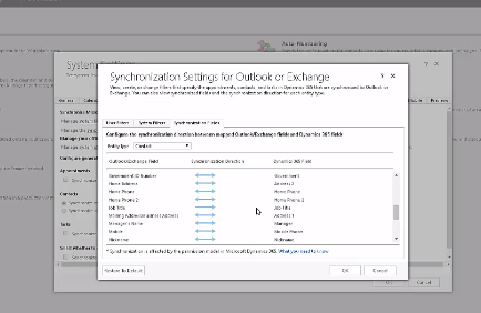 Go to Settings > Administration > System settings > Select the Synchronization tab > Manage fields Link the the below pop up will appear and choose which fields you don’t to be synchronized or Synchronize and one way Synchronize (for example : phone -> Outlook to Dynamics 365)