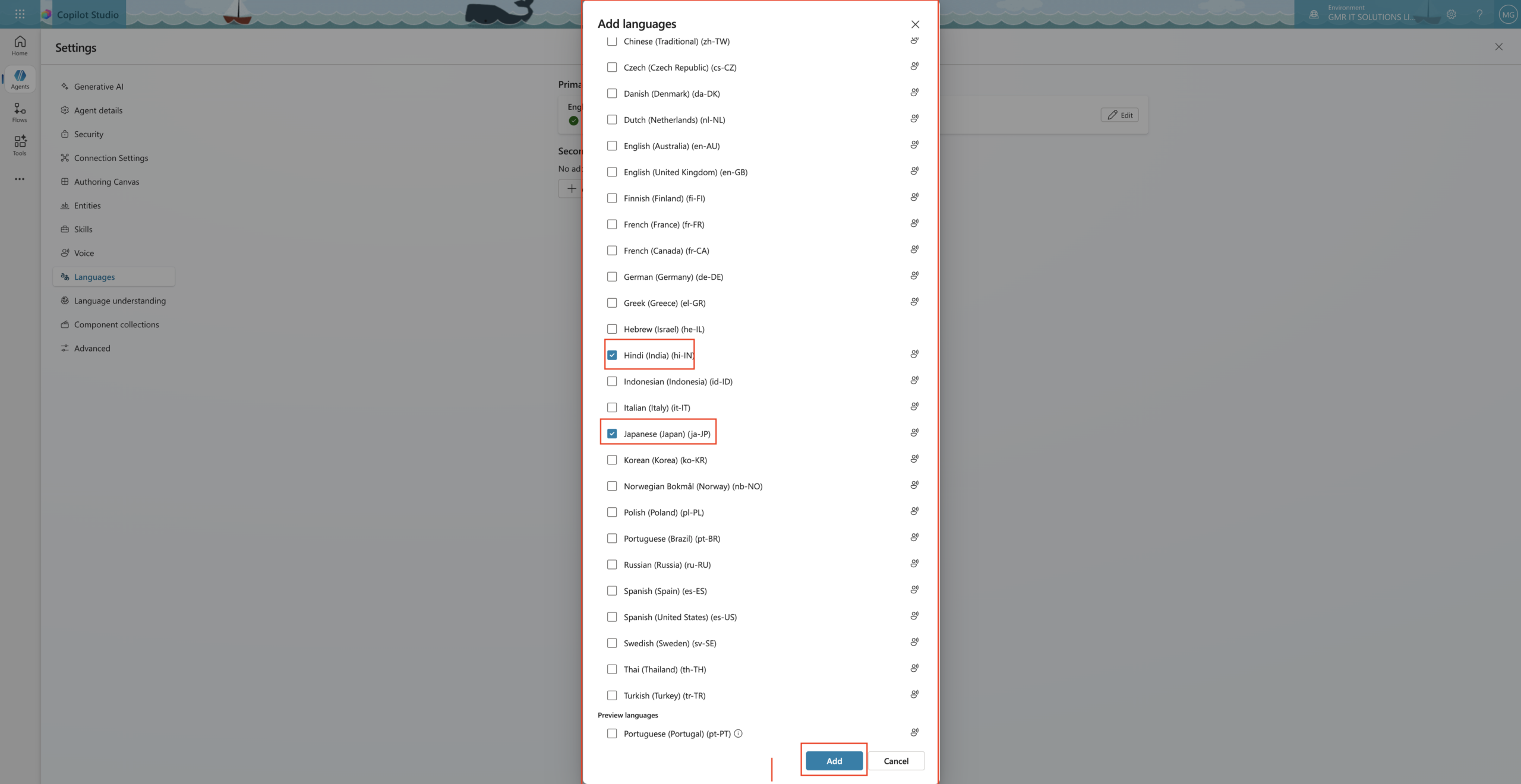When you create an agent, it has one primary language. You can add more by following these steps in Microsoft Copilot Studio.