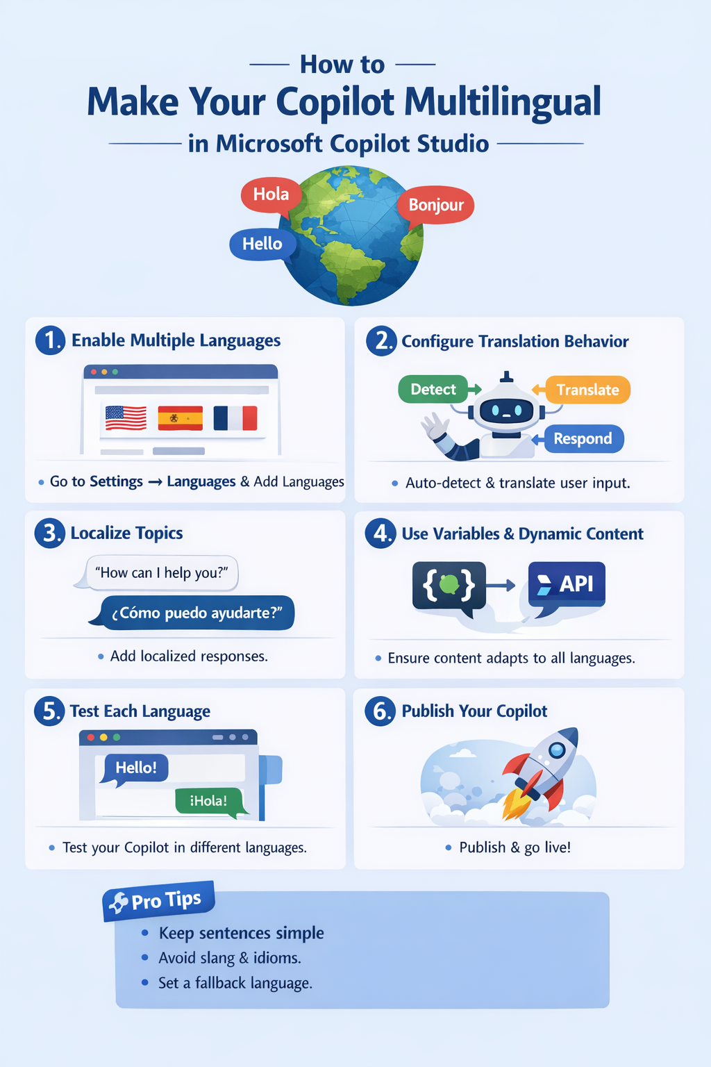 These guides detail how to configure Microsoft Copilot for Multilingual capabilities, covering language addition, localization and language-switching logic.