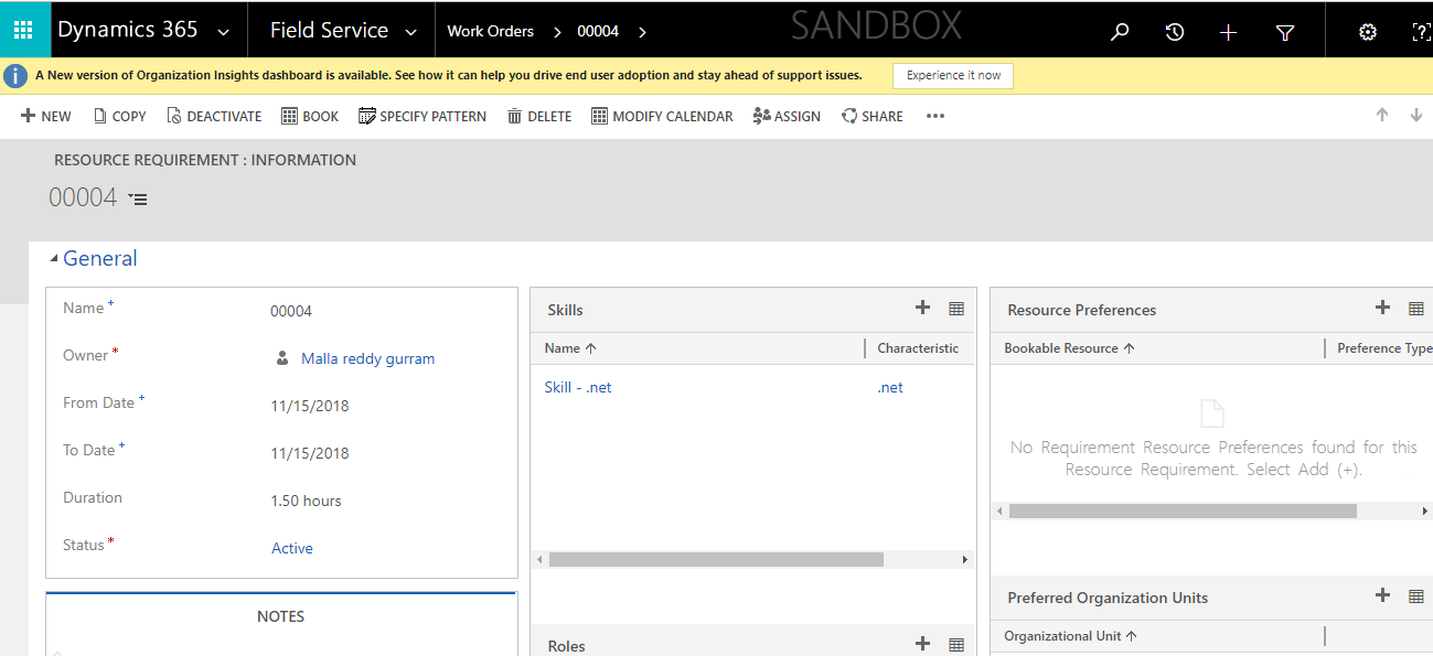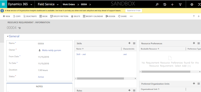 Just need to create the work order and save the record then select the related record of the “work order” created and select the requirement record where we can see the resource requirement details